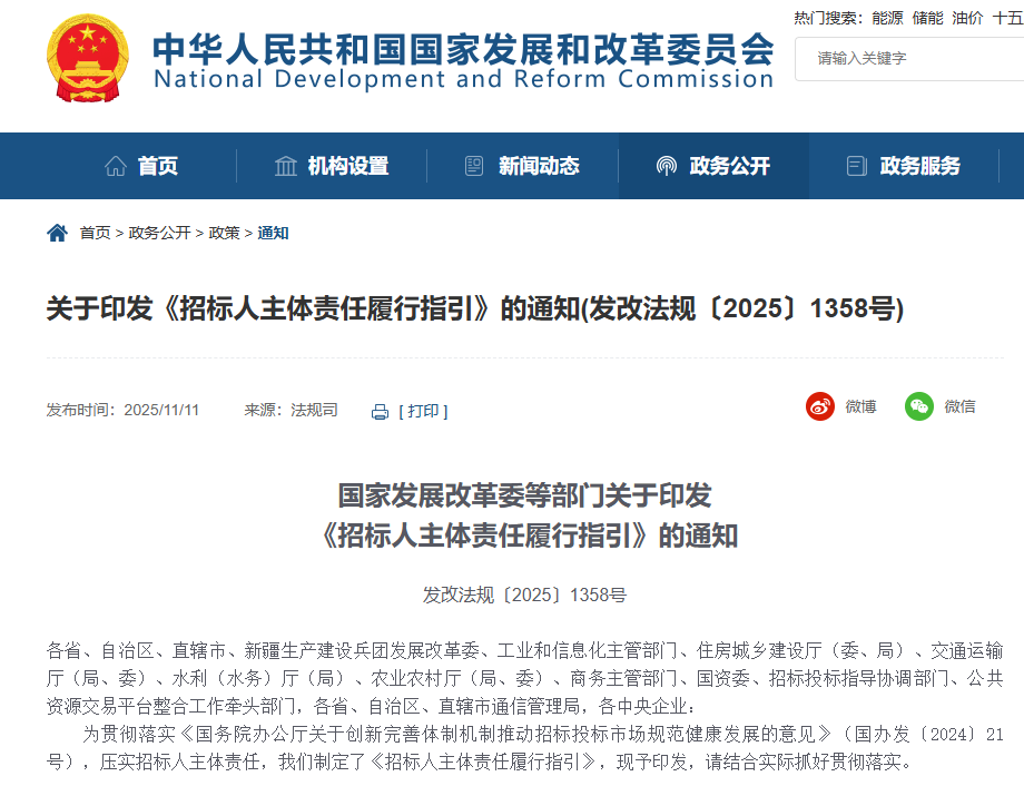 國家發(fā)展改革委等部門印發(fā)《招標(biāo)人主體責(zé)任履行指引》(發(fā)改法規(guī)〔2025〕1358號)